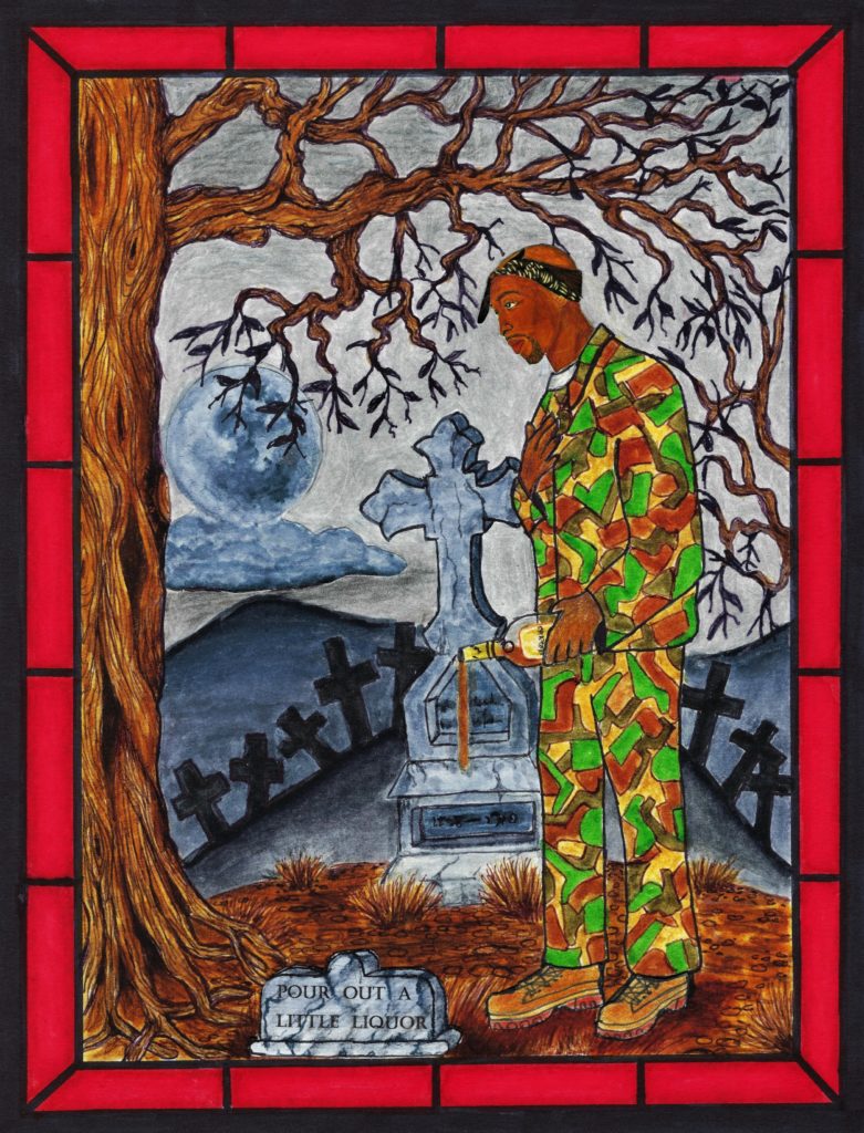 This illustration on page 177 combines Tupac’s music and acting careers. “Pour Out a Little Liquor,” which is written on one of the tombstones in the illustration, was a single off the soundtrack of Tupac’s 1994 film, Above the Rim. In the illustration, Tupac is pouring out a bottle of liquor in a cemetery and, like his character Birdie in Above the Rim, he is dressed in military camouflage.